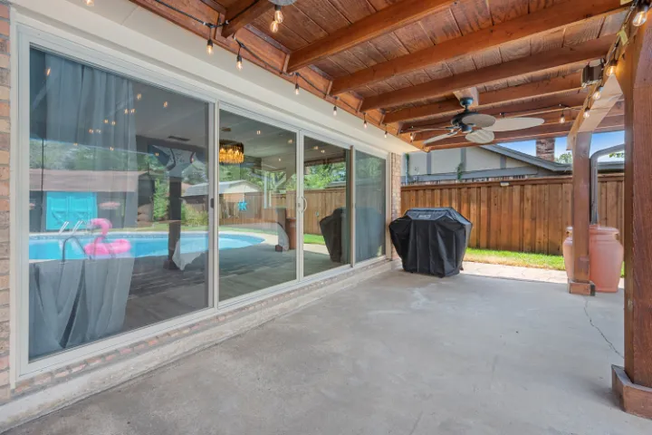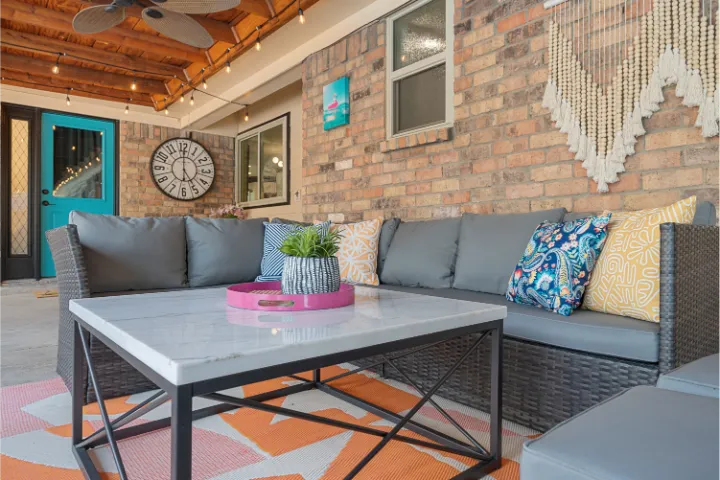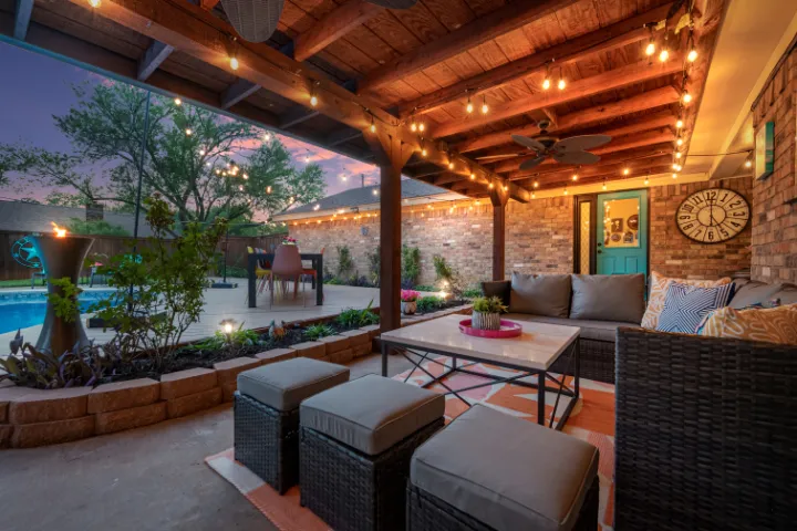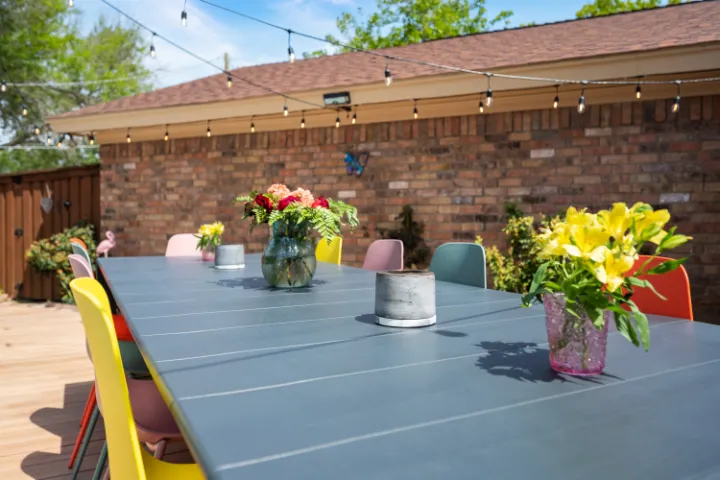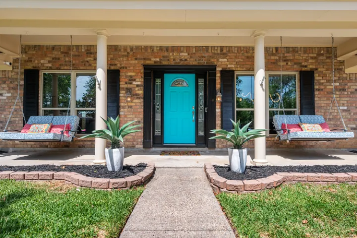 The exterior of the home features an in-ground saltwater pool (not heated), an oversized covered patio with 3 ceiling fans, a private fully fenced yard, an outdoor gas grill, comfy outdoor conversation seating, pool loungers, and a long 10-12 person outdoor dining table, under beautiful string lights which provide a sweet ambiance for dinner & drinks with your closest family or friends – or a romantic, quiet evening with your sweetie. When we added this outdoor feature, we envisioned the long outdoor table from the television ‘Parenthood.’ Some of you may be too young to remember this show… but we desired to imitate an intimate ‘Parenthood’ patio vibe. The front porch features two relaxing swings with cushions & pillows. In addition, guests have full access to the attached 2-car garage and can park indoors! covered patio with 3 ceiling fans, a private fully fenced yard, an outdoor gas grill, comfy outdoor conversation seating, pool loungers, and a long 10-12 person outdoor dining table, under beautiful string lights which provide a sweet ambiance for dinner & drinks with your closest family or friends – or a romantic, quiet evening with your sweetie💖. The front porch features two relaxing swings with cushions & pillows. In addition, guests have full access to the attached 2-car garage and can park indoors!
