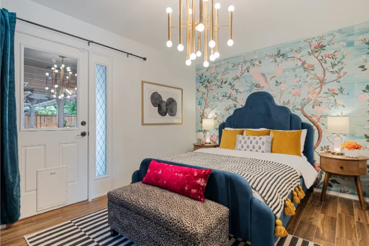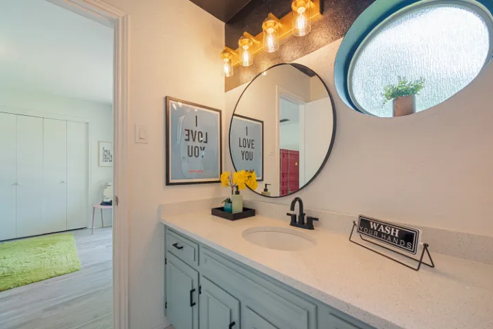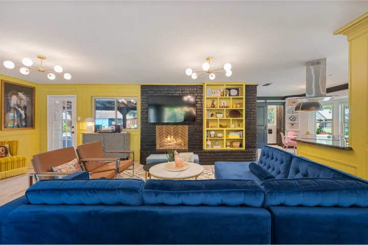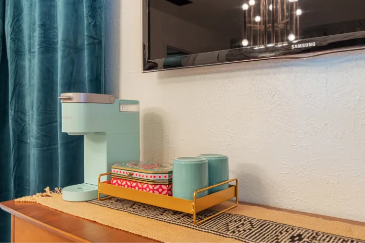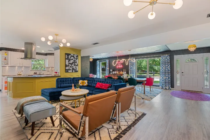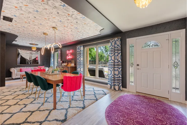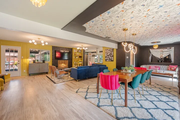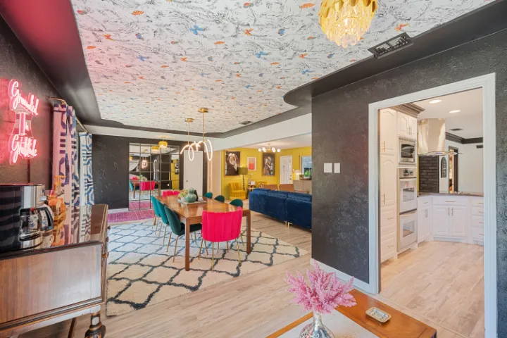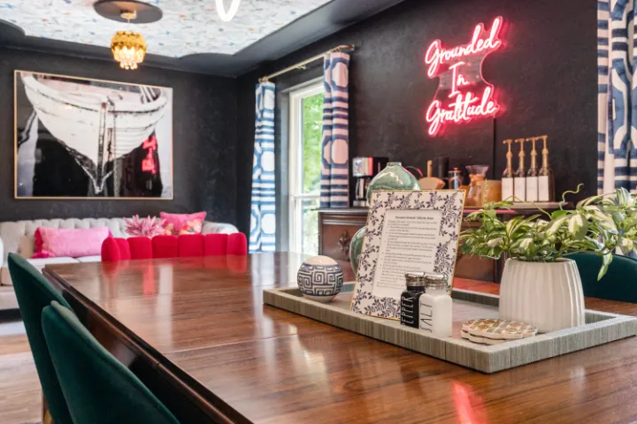 The interior of the home features 4 bedrooms, 3 bathrooms, and 2,200 square feet all on 1 level – no stairs or carpet anywhere. The home has recently been remodeled and boasts an open floor plan with bold colors, fun & mismatched patterns, dramatic wallpaper accents throughout, and unique decor/art choices to make the home feel eccentric & exciting, yet peaceful & cozy! There is even a bright neon ‘Grounded in Gratitude’ sign above the coffee bar that shouts “fun & caffeine” but also serves as a reminder for us to “be grateful always!”