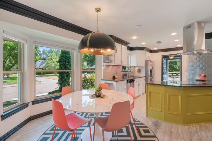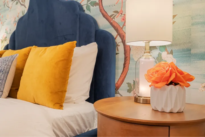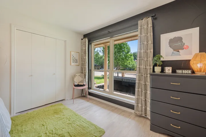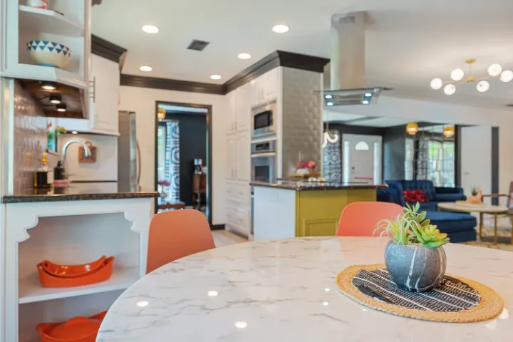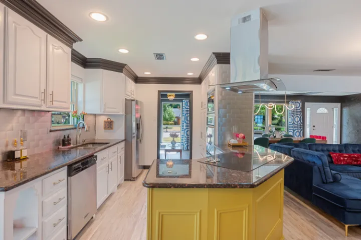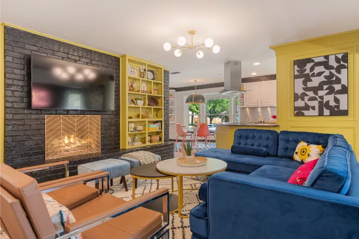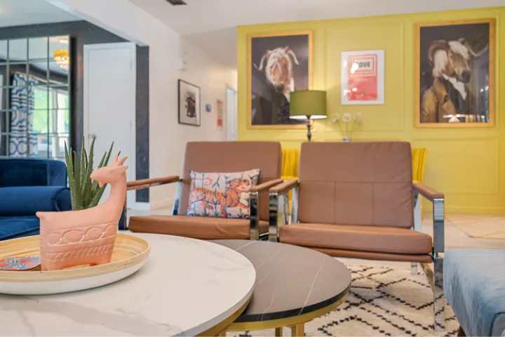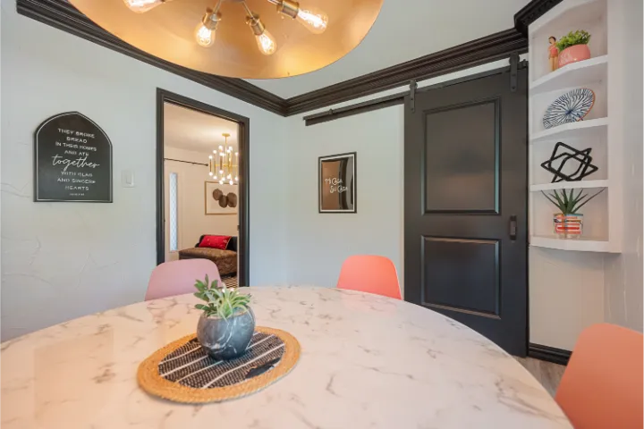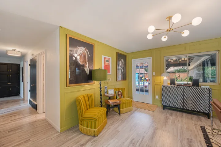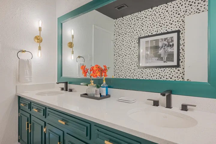 The interior of the home features 4 bedrooms, 3 bathrooms, and 2,200 square feet all on 1 level – no stairs or carpet anywhere. The home has recently been remodeled and boasts an open floor plan with bold colors, fun & mismatched patterns, dramatic wallpaper accents throughout, and unique decor/art choices to make the home feel eccentric & exciting, yet peaceful & cozy! There is even a bright neon ‘Grounded in Gratitude’ sign above the coffee bar that shouts “fun & caffeine” but also serves as a reminder for us to “be grateful always!”
