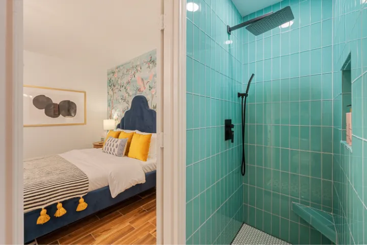 - Long, teak wood bench to place in the walk-in shower for guests who need to sit to bathe