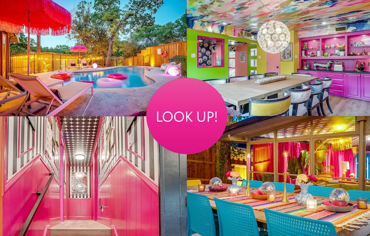 Welcome to LOOK UP! Only 5 mi from AT&T + Globe Life + in the center of all DFW hot spots, you’ll find it to be the perfect location! Guests are encouraged to “look up” at Jesus + wallpaper/art on every ceiling. 4bed/3bath home features a chef’s kitchen, pool, resort style backyard, poolside Casita & 2 patios. This house was designed for bachelorette trips, girls’ getaways & family gatherings!