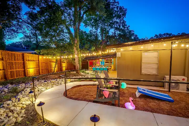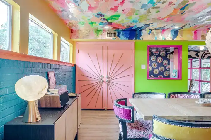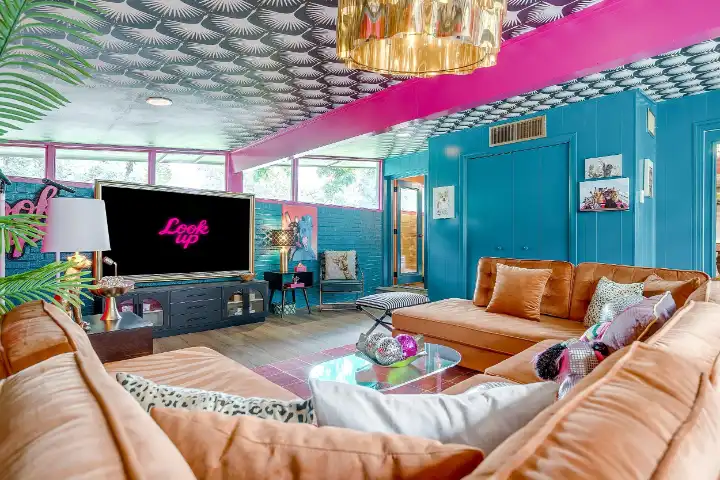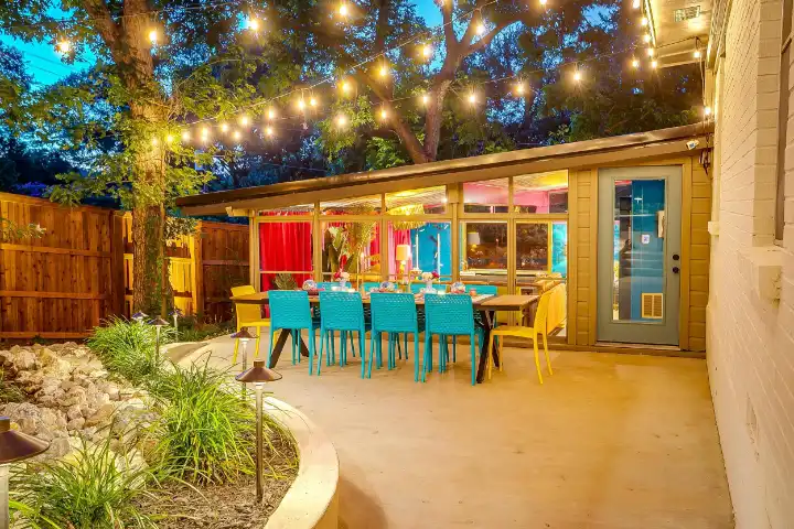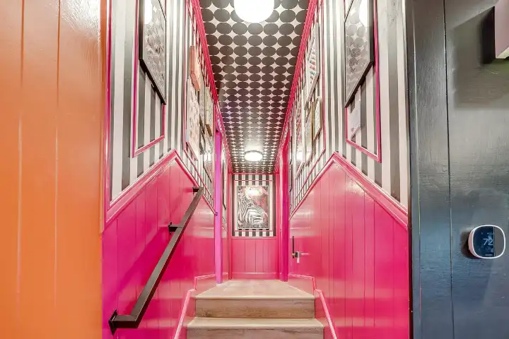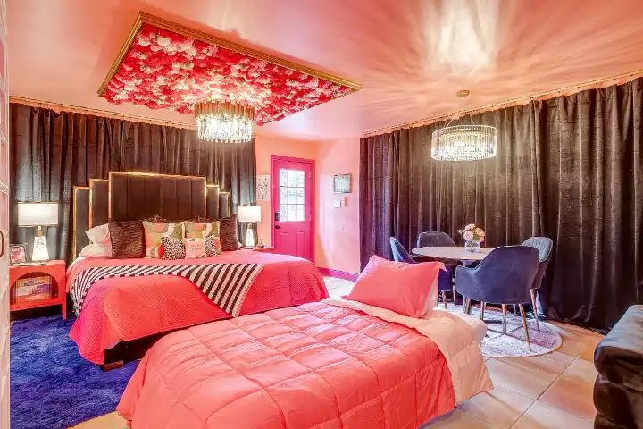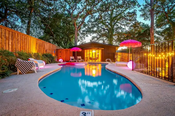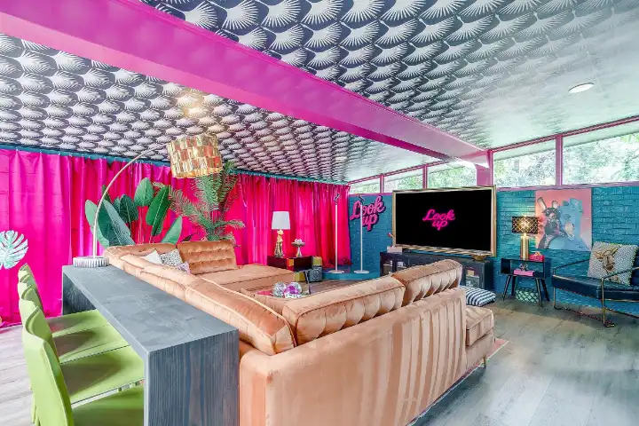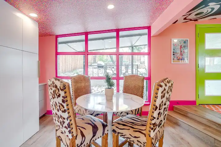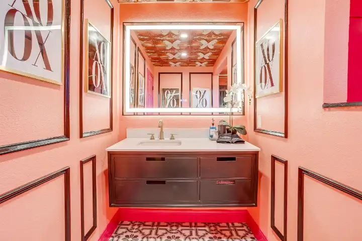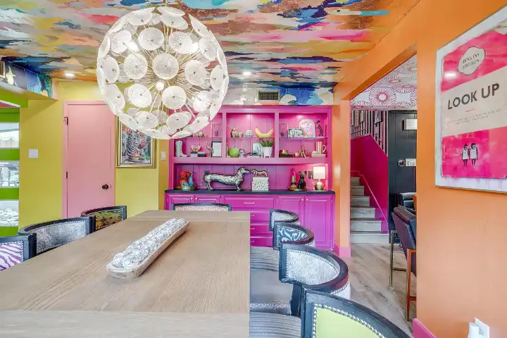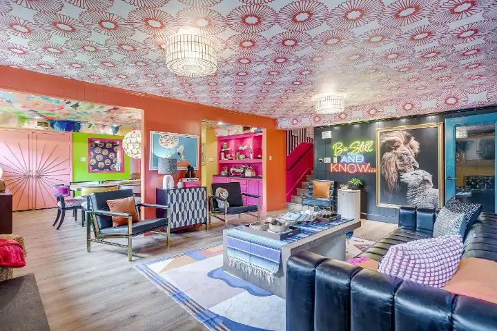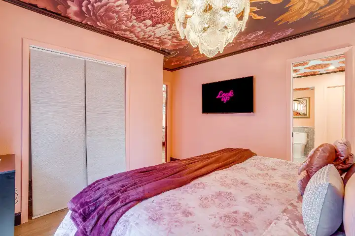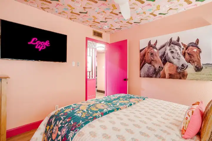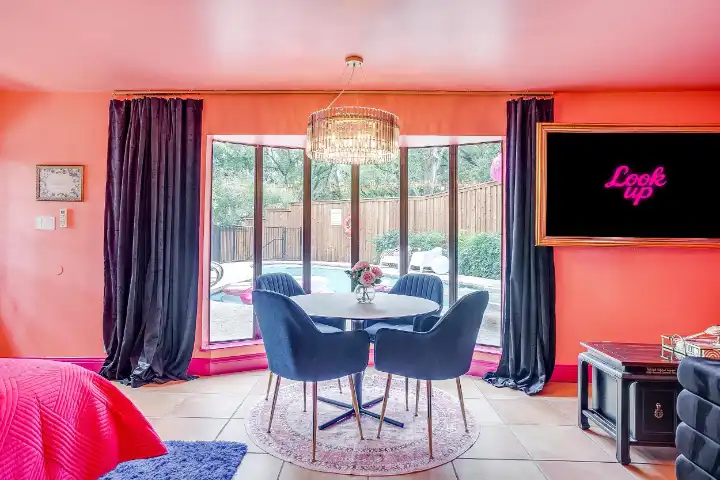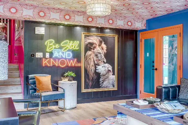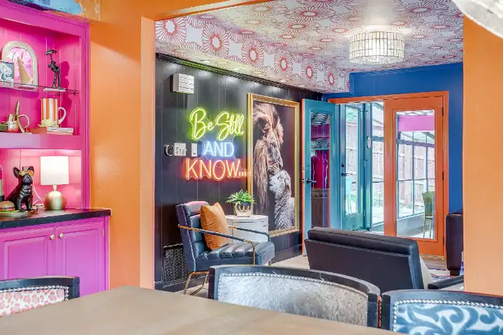 The interior of the main house features 3 bedrooms, 2 bathrooms and 2,162 sq ft. When trying to explain the vibe of this home, think mid-century + color blast + topped with an explosion of wallpaper art on each ceiling. Every room has a different theme and color scheme. It is a one-of-a-kind, non-mimicable home! The main level floor plan is very open & fluid. Multiple sitting areas in the home allow guests to enjoy their own space & conversations. The kitchen was recently renovated and ready for chef-like creations while enjoying a wall of windows with a view of the resort-like backyard. The formal dining room table holds up to 10 guests comfortably with customized mis-matched chairs to complement the maximalist nature of the space. The living room exquisitely spells out chill mode in a Jesus sort of way to enjoy reading or intimate conversation with friends & family, with no television in this room. The Lion & Lamb artwork is the centerpiece adjacent to the customized neon light that reads “Be Still and Know.” This is the essence of this room – Be Still & Chill! From the living room, you can walk into a vibrant family room ready for pure fun! Here you’ll enjoy a u-shaped velvet sofa & a 70-inch gold-framed TV, ready for movie night or a karaoke-sing-along, with dual karaoke mics & a karaoke speaker. Behind the sofa, you’ll enjoy a table with 4 chairs, so the whole crowd can watch the performance! The family room is also adjacent to the outdoor dinner patio with windows spanning across the entire space, making the outdoor & indoor spaces blend seamlessly. The hallway leading to the beds & baths is nothing short of exuberant. With encouraging Gospel truths & reminders to look at Jesus, it is exactly what every bedhead needs to read when waking up in the morning! The 3 bedrooms upstairs are lavishly designed with a twist of wild & crazy. The home & bedrooms have a dainty, feminine vibe throughout! Again, each bedroom has a different theme & color scheme. The primary bedroom has its own private bathroom. Each bathroom in the home was recently remodeled and features tile accents, luxe showers, quartz countertops & upgraded lighting.