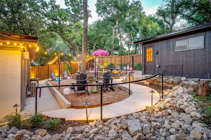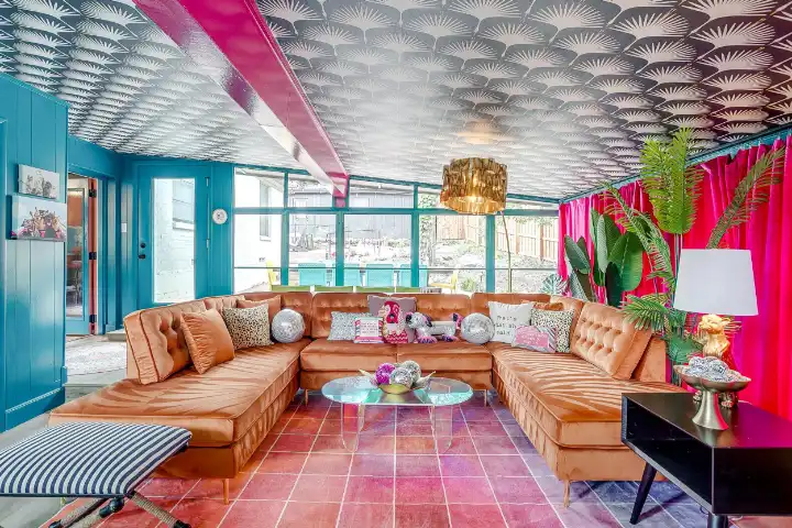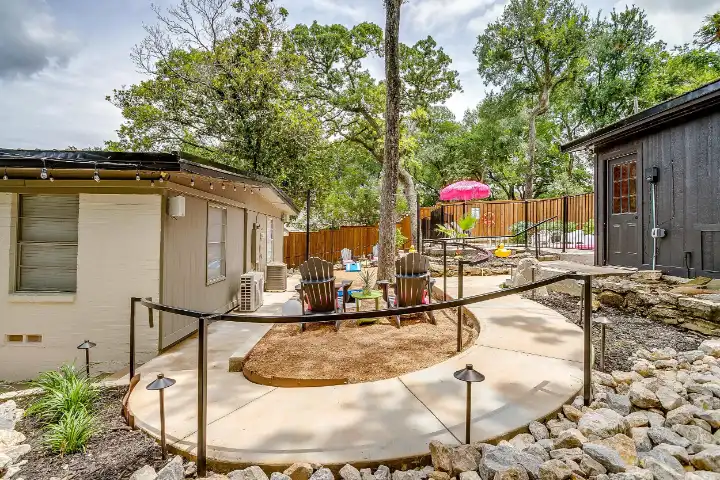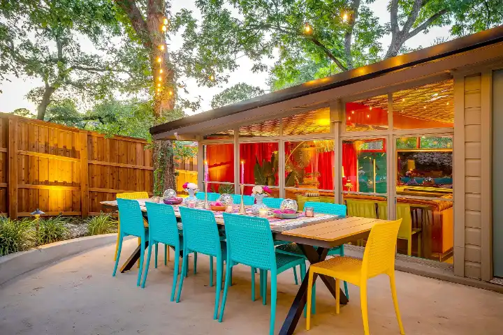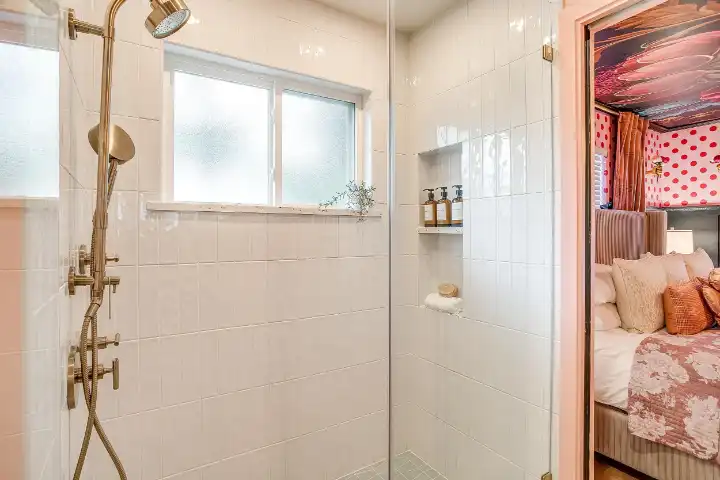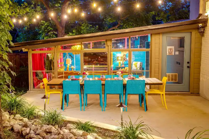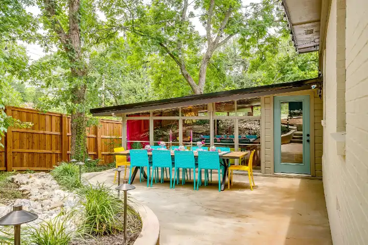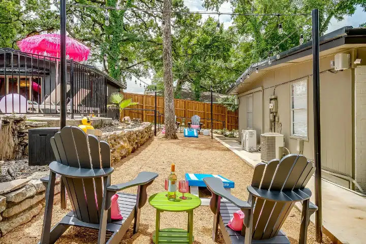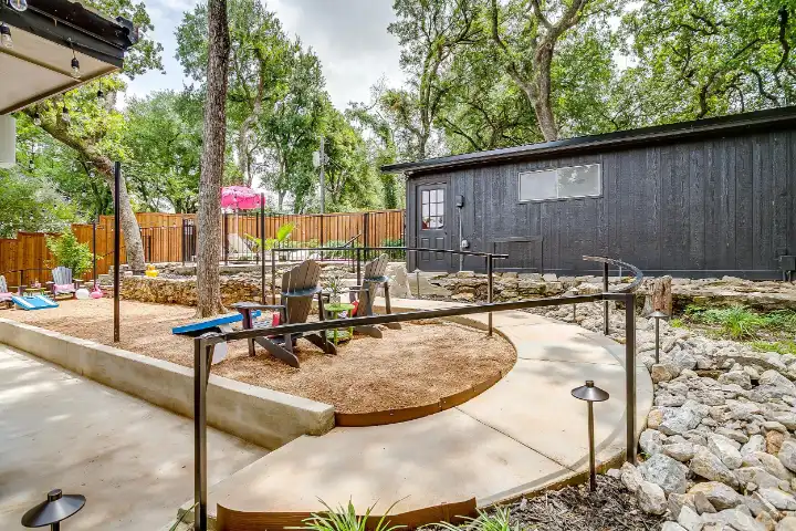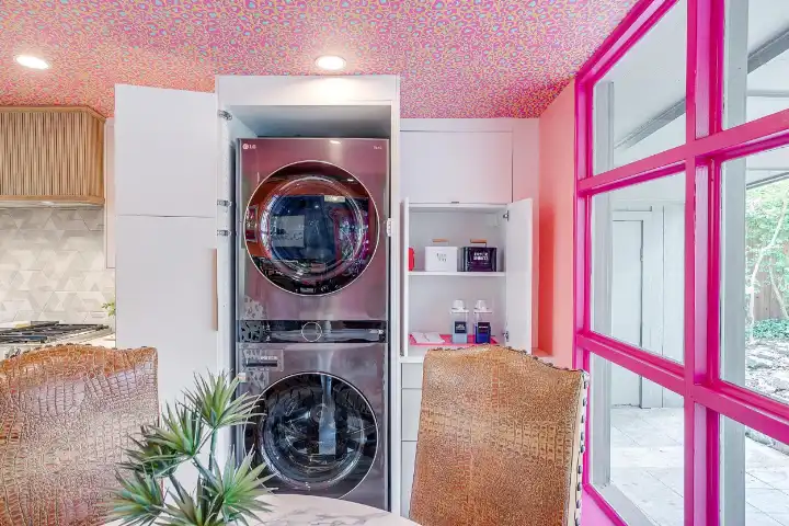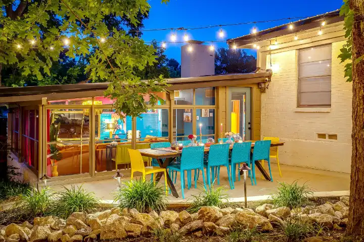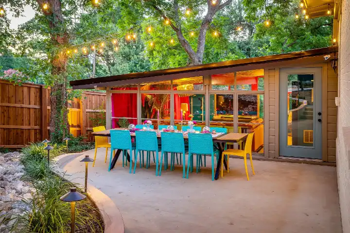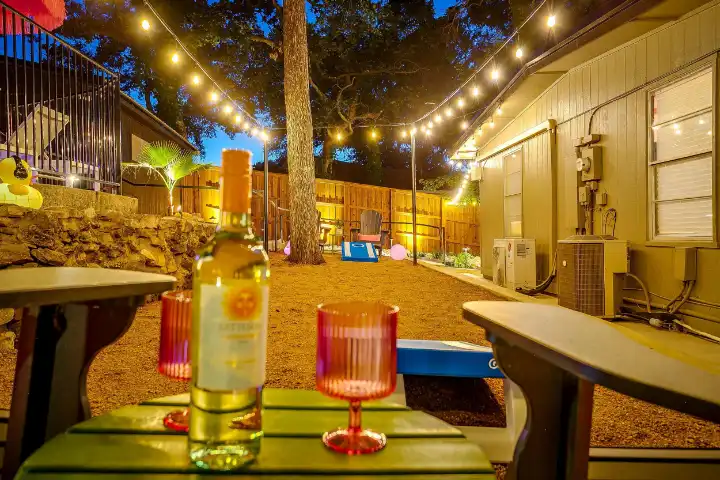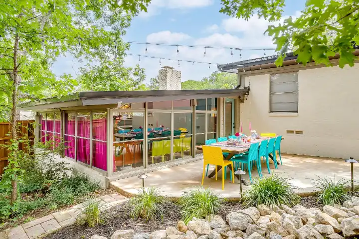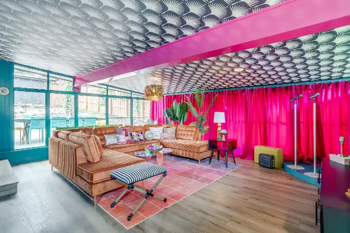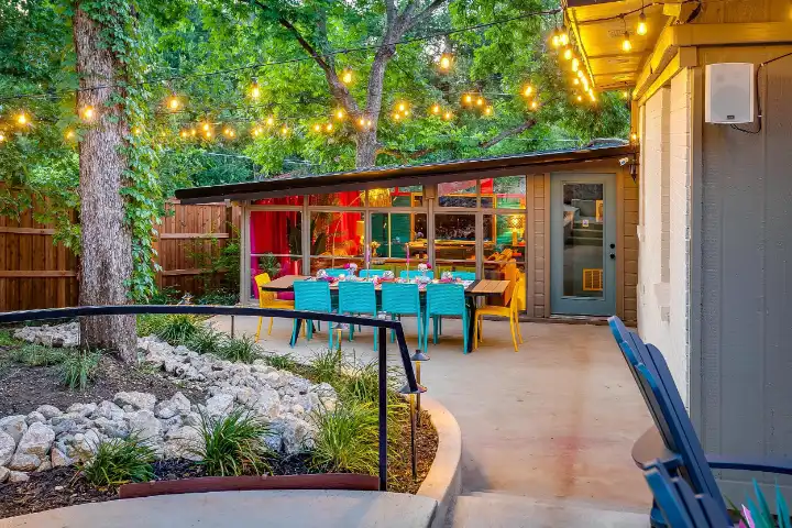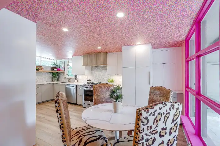 The interior of the main house features 3 bedrooms, 2 bathrooms and 2,162 sq ft. When trying to explain the vibe of this home, think mid-century + color blast + topped with an explosion of wallpaper art on each ceiling. Every room has a different theme and color scheme. It is a one-of-a-kind, non-mimicable home! The main level floor plan is very open & fluid. Multiple sitting areas in the home allow guests to enjoy their own space & conversations. The kitchen was recently renovated and ready for chef-like creations while enjoying a wall of windows with a view of the resort-like backyard. The formal dining room table holds up to 10 guests comfortably with customized mis-matched chairs to complement the maximalist nature of the space. The living room exquisitely spells out chill mode in a Jesus sort of way to enjoy reading or intimate conversation with friends & family, with no television in this room. The Lion & Lamb artwork is the centerpiece adjacent to the customized neon light that reads “Be Still and Know.” This is the essence of this room – Be Still & Chill! From the living room, you can walk into a vibrant family room ready for pure fun! Here you’ll enjoy a u-shaped velvet sofa & a 70-inch gold-framed TV, ready for movie night or a karaoke-sing-along, with dual karaoke mics & a karaoke speaker. Behind the sofa, you’ll enjoy a table with 4 chairs, so the whole crowd can watch the performance! The family room is also adjacent to the outdoor dinner patio with windows spanning across the entire space, making the outdoor & indoor spaces blend seamlessly. The hallway leading to the beds & baths is nothing short of exuberant. With encouraging Gospel truths & reminders to look at Jesus, it is exactly what every bedhead needs to read when waking up in the morning! The 3 bedrooms upstairs are lavishly designed with a twist of wild & crazy. The home & bedrooms have a dainty, feminine vibe throughout! Again, each bedroom has a different theme & color scheme. The primary bedroom has its own private bathroom. Each bathroom in the home was recently remodeled and features tile accents, luxe showers, quartz countertops & upgraded lighting.