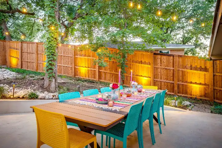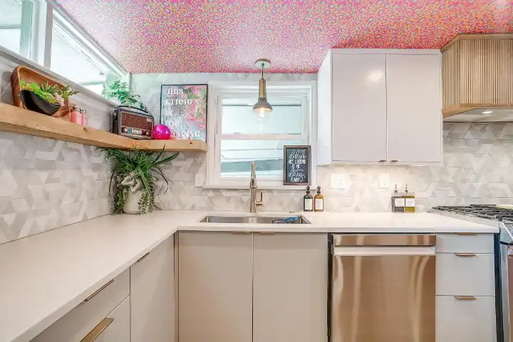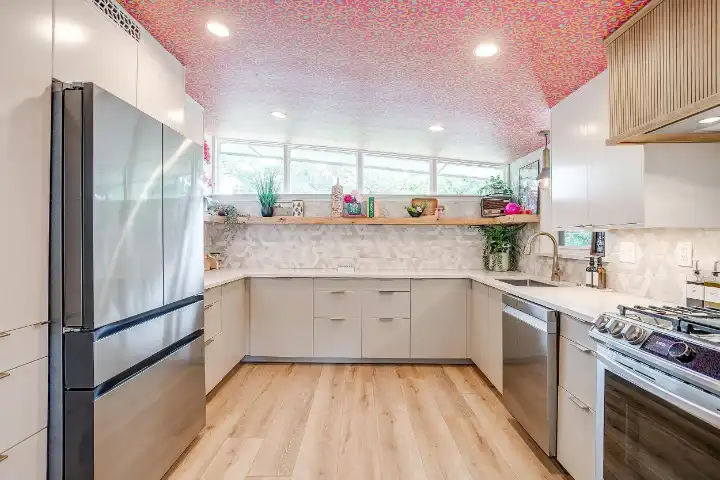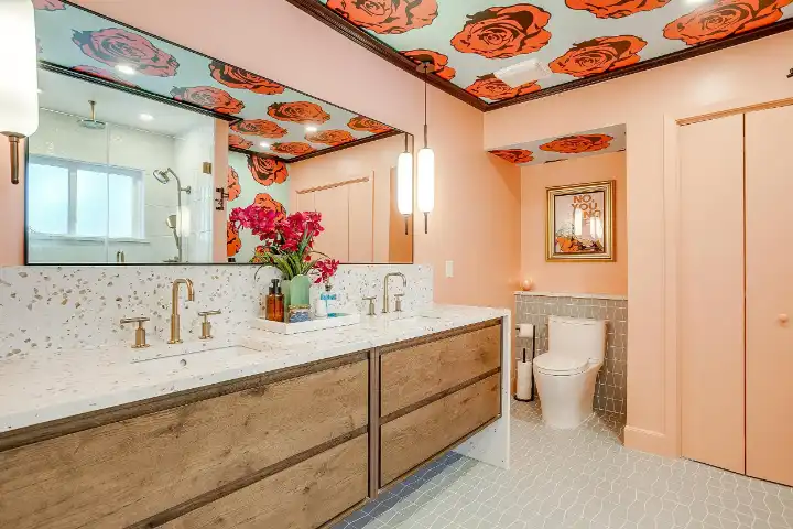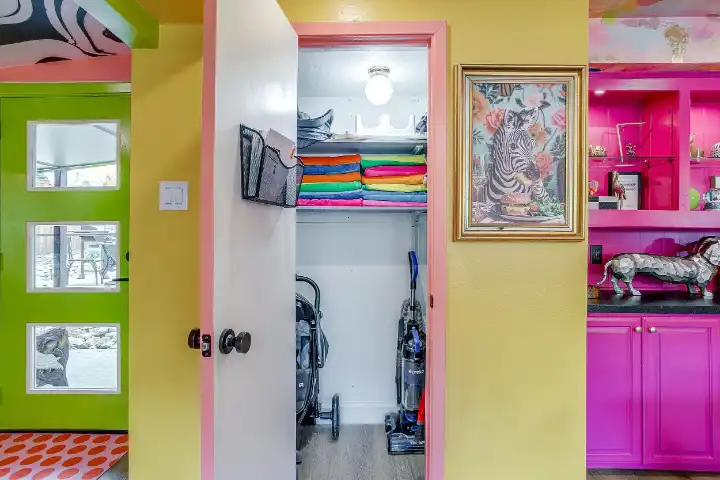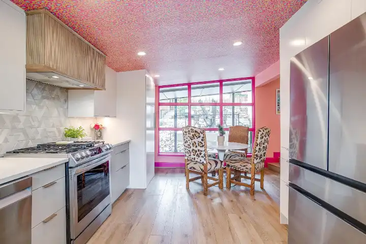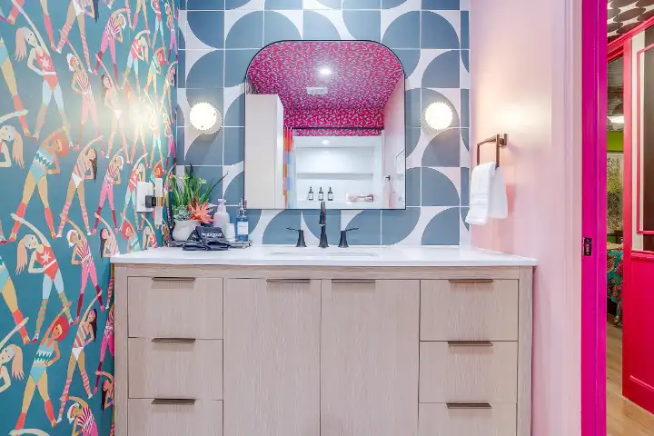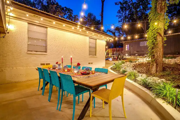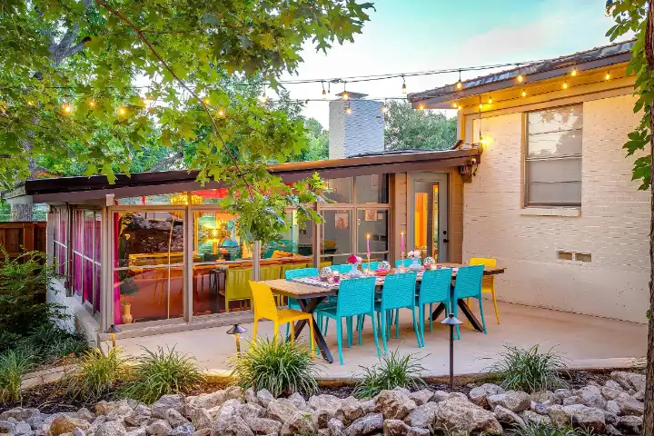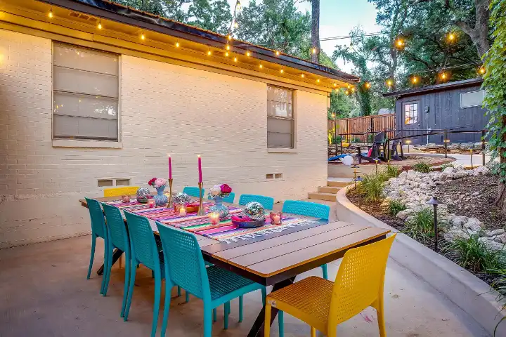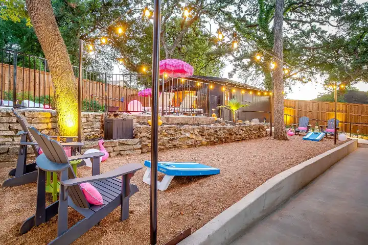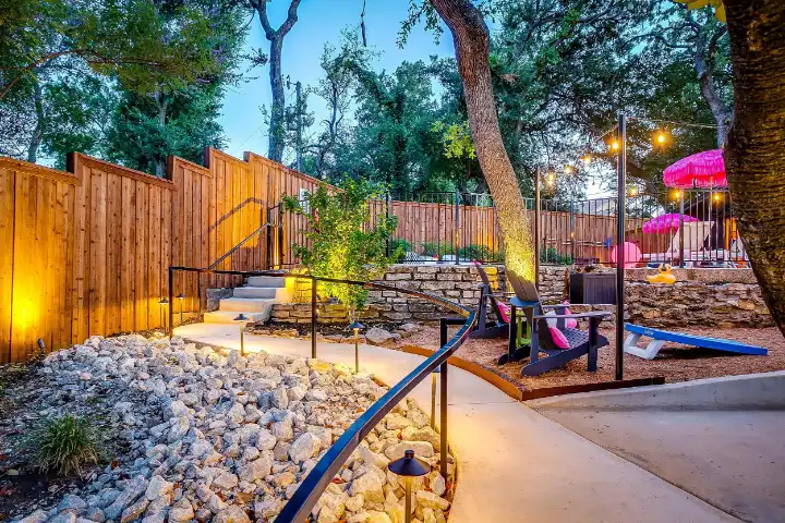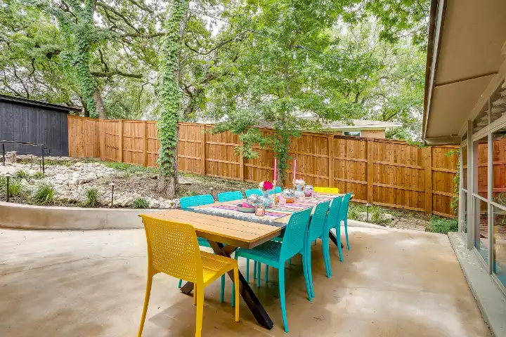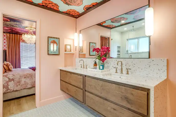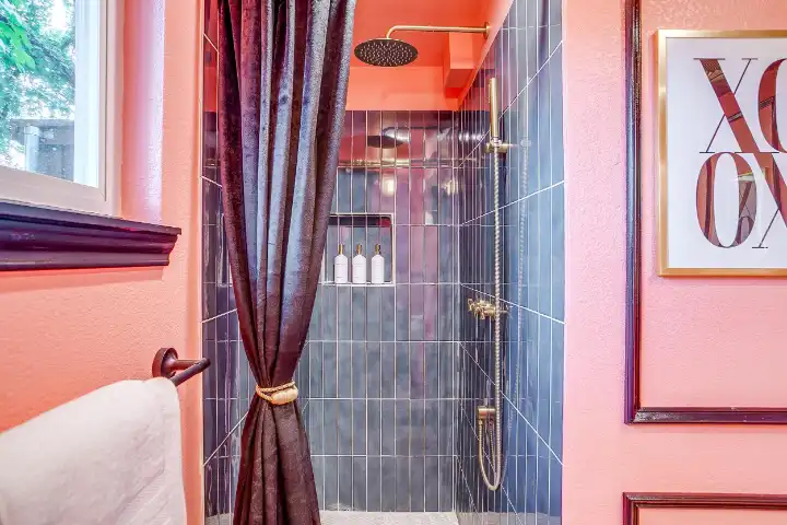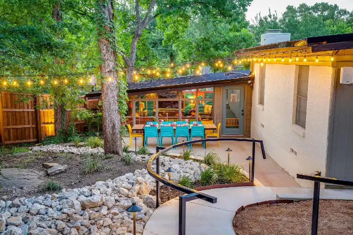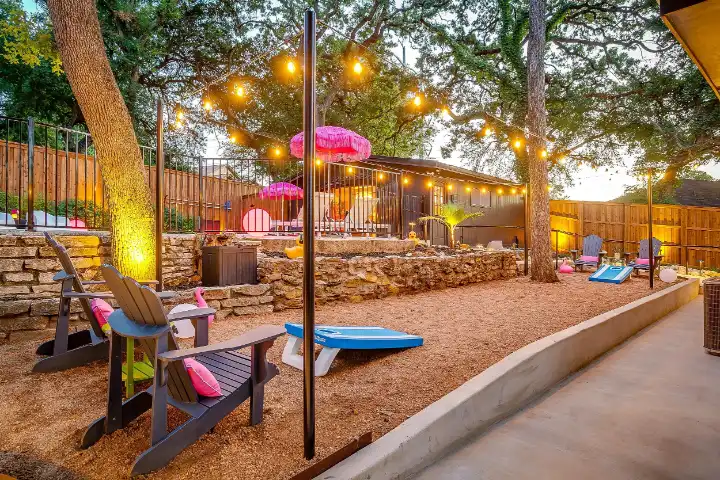 The interior of the main house features 3 bedrooms, 2 bathrooms and 2,162 sq ft. When trying to explain the vibe of this home, think mid-century + color blast + topped with an explosion of wallpaper art on each ceiling. Every room has a different theme and color scheme. It is a one-of-a-kind, non-mimicable home! The main level floor plan is very open & fluid. Multiple sitting areas in the home allow guests to enjoy their own space & conversations. The kitchen was recently renovated and ready for chef-like creations while enjoying a wall of windows with a view of the resort-like backyard. The formal dining room table holds up to 10 guests comfortably with customized mis-matched chairs to complement the maximalist nature of the space. The living room exquisitely spells out chill mode in a Jesus sort of way to enjoy reading or intimate conversation with friends & family, with no television in this room. The Lion & Lamb artwork is the centerpiece adjacent to the customized neon light that reads “Be Still and Know.” This is the essence of this room – Be Still & Chill! From the living room, you can walk into a vibrant family room ready for pure fun! Here you’ll enjoy a u-shaped velvet sofa & a 70-inch gold-framed TV, ready for movie night or a karaoke-sing-along, with dual karaoke mics & a karaoke speaker. Behind the sofa, you’ll enjoy a table with 4 chairs, so the whole crowd can watch the performance! The family room is also adjacent to the outdoor dinner patio with windows spanning across the entire space, making the outdoor & indoor spaces blend seamlessly. The hallway leading to the beds & baths is nothing short of exuberant. With encouraging Gospel truths & reminders to look at Jesus, it is exactly what every bedhead needs to read when waking up in the morning! The 3 bedrooms upstairs are lavishly designed with a twist of wild & crazy. The home & bedrooms have a dainty, feminine vibe throughout! Again, each bedroom has a different theme & color scheme. The primary bedroom has its own private bathroom. Each bathroom in the home was recently remodeled and features tile accents, luxe showers, quartz countertops & upgraded lighting.