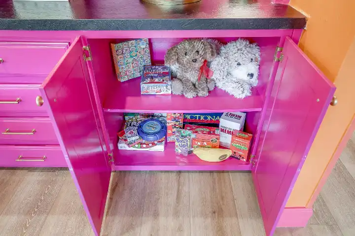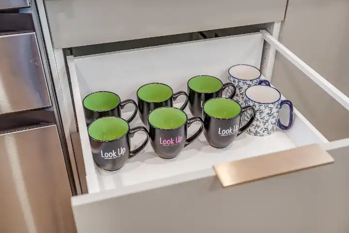 Kitchen also comes equipped with branded “Look Up” coffee mugs, cooking utensils, hand mixer, blender, toaster, crockpot, napkins, pitcher, paper towels, silicone trivets & potholders, chip clips, plastic storage bags, plastic wrap, aluminum foil, etc.