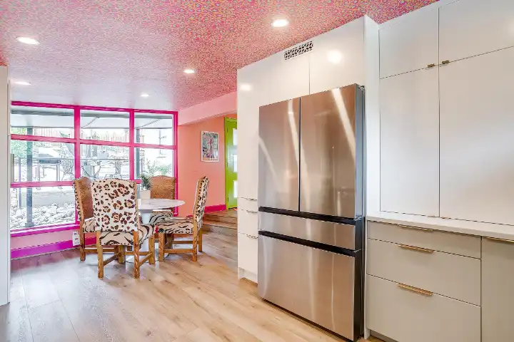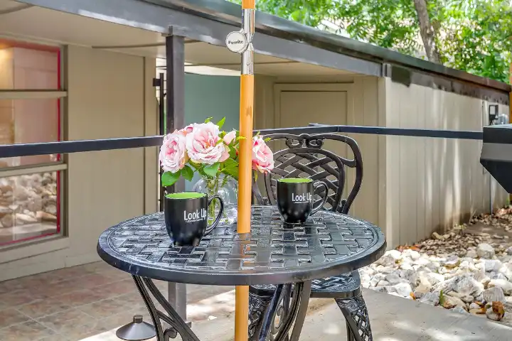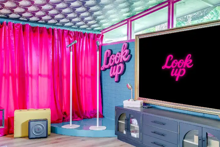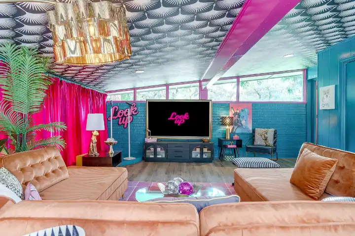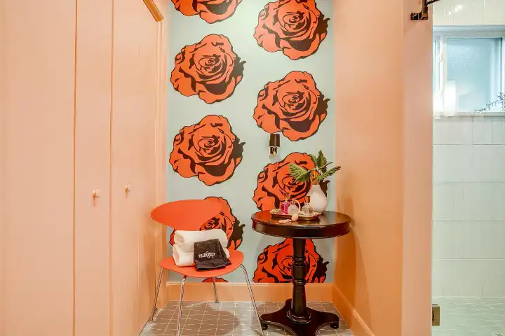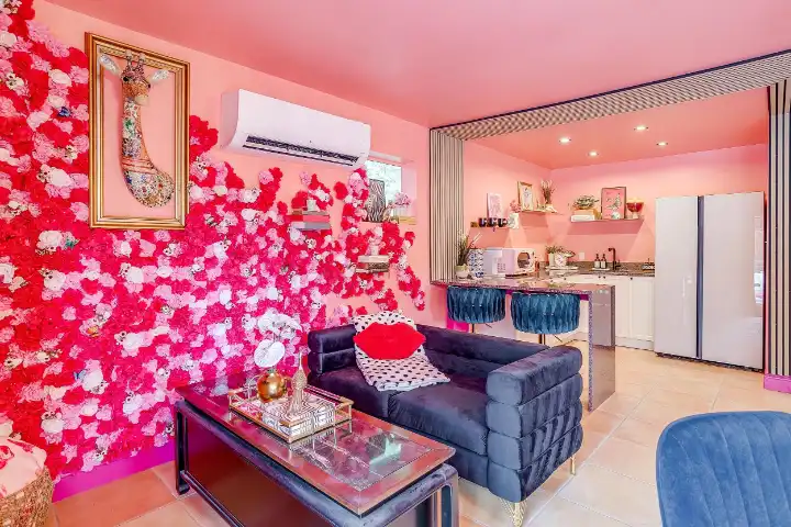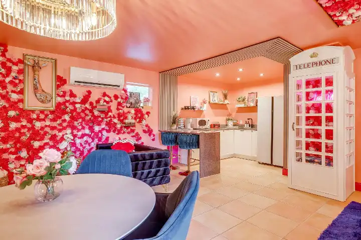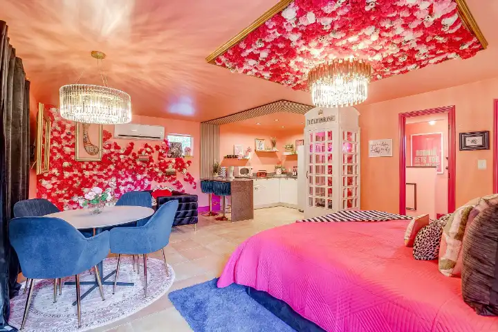 The Casita is a 540 SqFt poolside guest house behind the main house. It features a thoughtfully equipped kitchenette with a peninsula bar, a 3/4 bathroom, a small living room space with a small sofa & a large TV, a dinette space & a king-sized bed. Finally, the Casita features a visually striking gold-framed floral ceiling above the bed, a whimsical floral accent wall, and an ornate and custom telephone booth for special photo ops with a custom “Look Up” neon light, a floral wall, an antique phone & whimsy stool to make your photos extra cute!