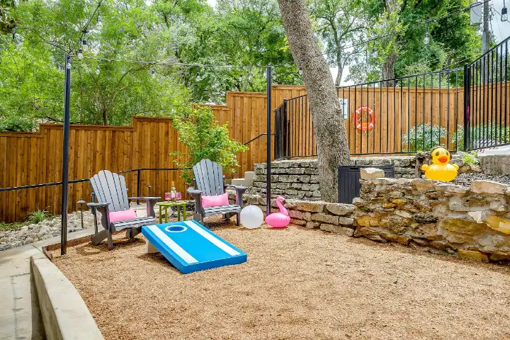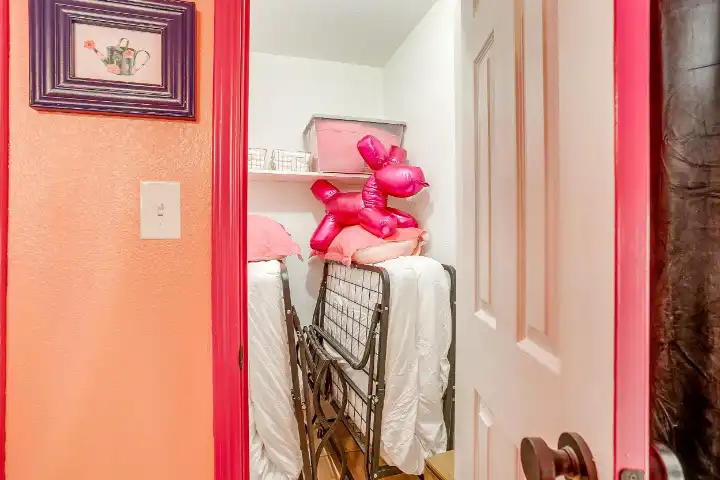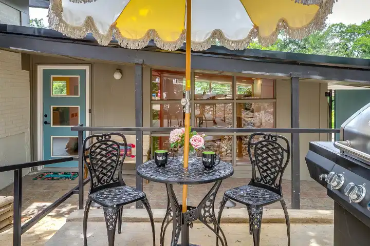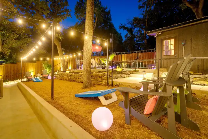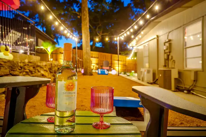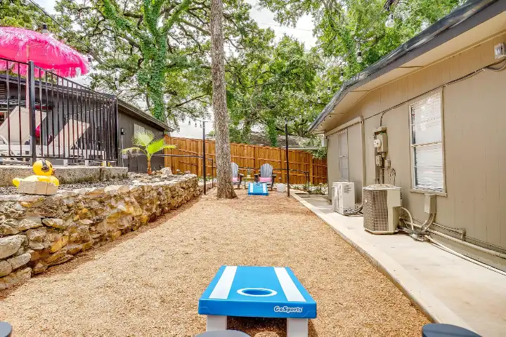 Outside you’ll enjoy an in-ground saltwater pool (not heated), an oversized patio with a large outdoor dining table, and a smaller patio with a bistro garden table & chairs, an umbrella & a propane grill. The resort style backyard also features pool loungers & pool chairs, a special space for cornhole & relaxed outdoor game seating, beautiful string lights for a sweet ambiance & outdoor Bluetooth speakers to play your perfect vacation soundtrack.